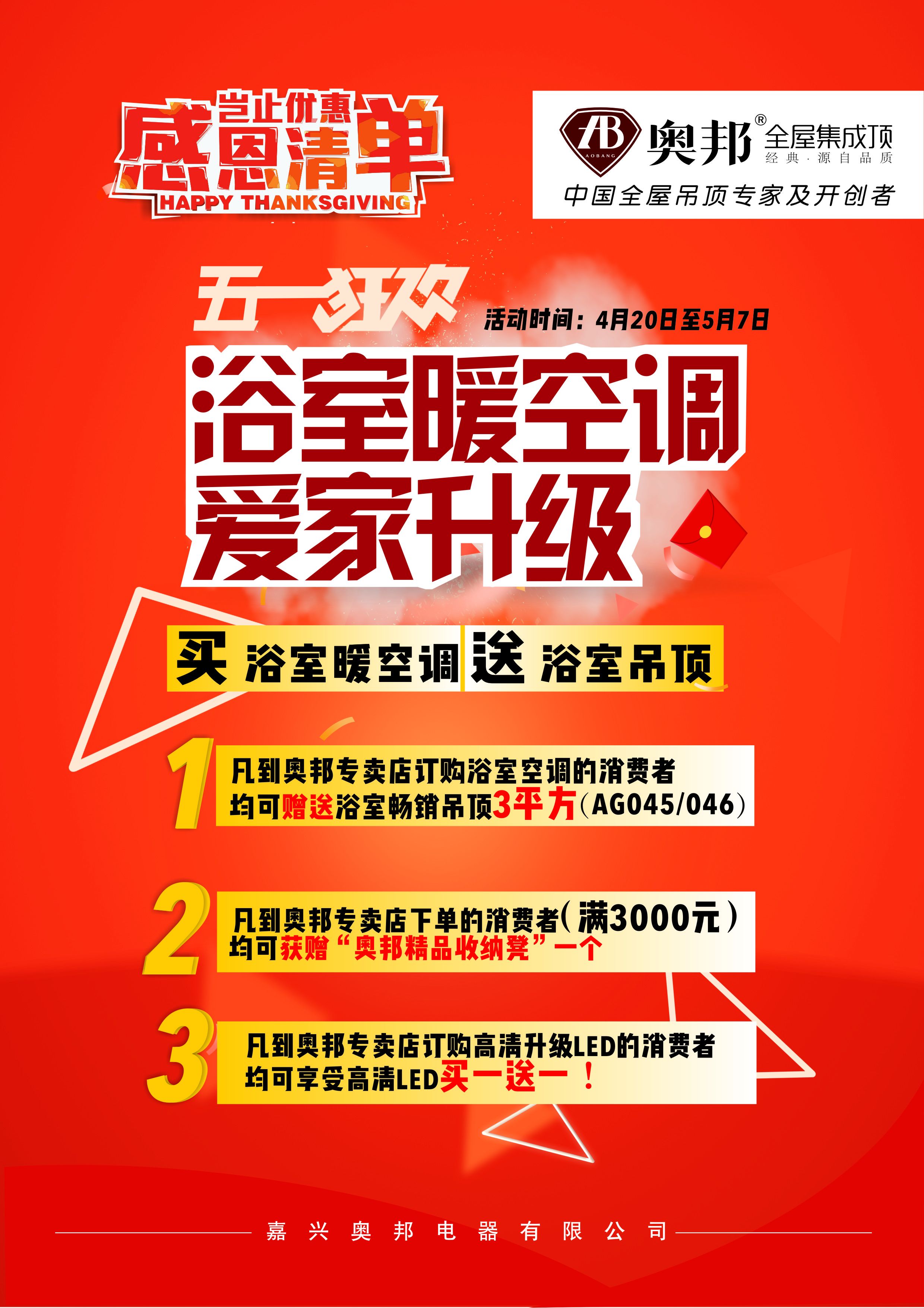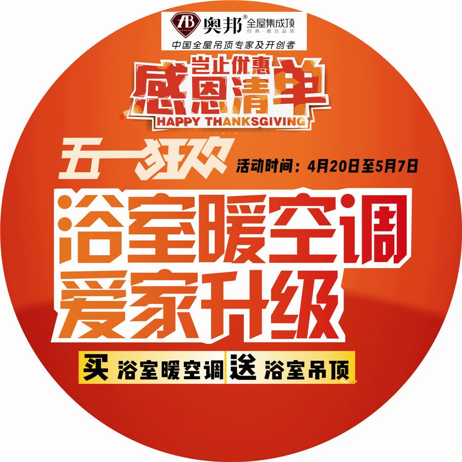 五月是勞動人民的節(jié)日,奧邦全屋集成頂從4月20日到5月7日推出“五一狂歡”活動。一、凡到奧邦專賣店訂購浴室空調(diào)的消費者均可贈送浴室暢銷吊頂3平方(AG045/046) 二、凡到奧邦專賣店下單的消費者(滿3000元)均可獲贈奧邦精品收納凳一個 三、凡到奧邦專賣店訂購高清升級LED的消費者均可享受高清LED買一送一! 如有不明請咨詢奧邦專賣店客服人員。奧邦全屋集成頂保留對此次活動的最終解釋權(quán)